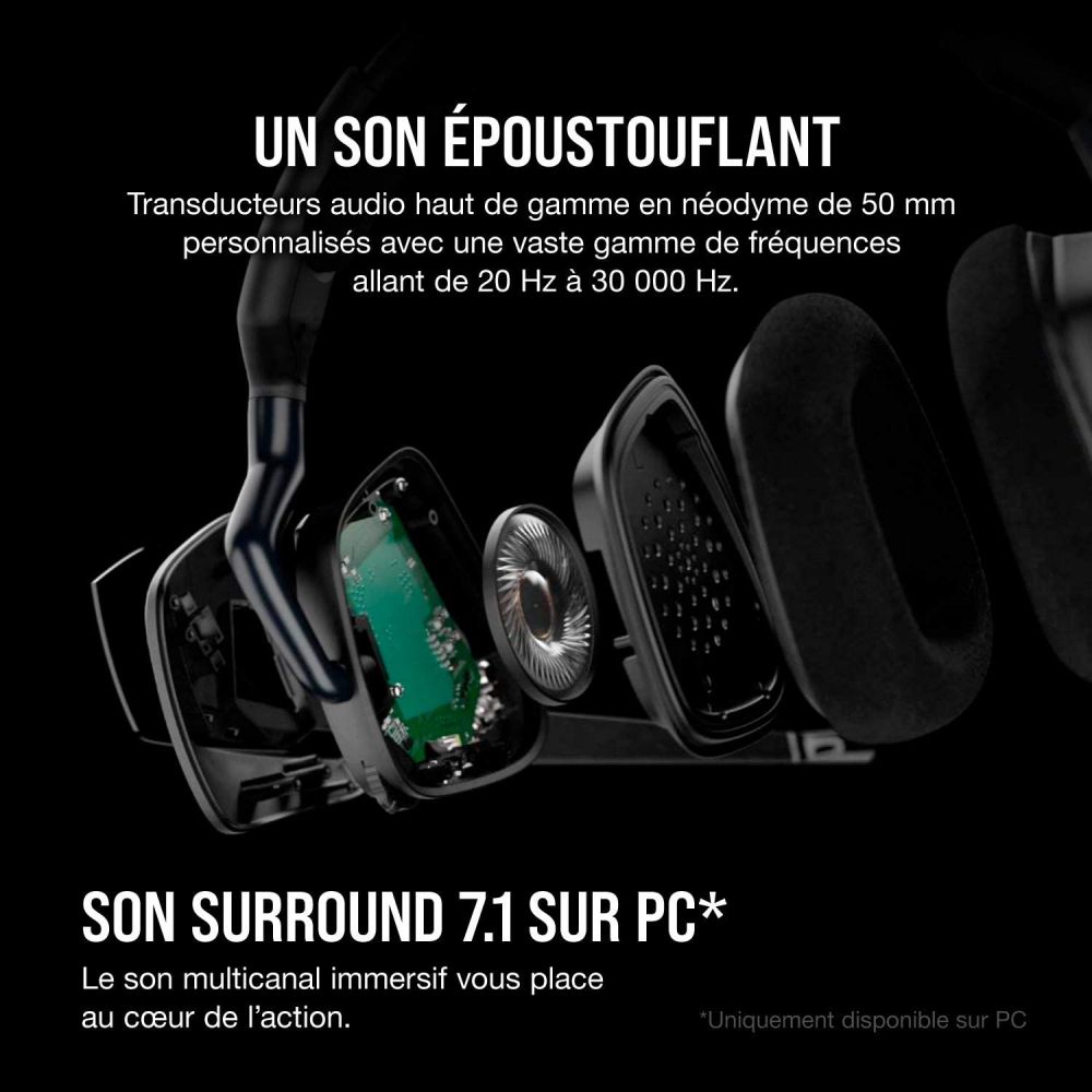 Le CORSAIR VOID RGB ELITE Wireless est un casque de jeu haut de gamme qui offre une connexion sans fil, un son surround 7.1 et un éclairage RGB personnalisable. Il est équipé de haut-parleurs néodyme de 50 mm réglés sur mesure pour offrir un son clair et équilibré, tandis que le tissu en microfibre et les oreillettes en mousse à mémoire de forme offrent un confort durable. Le casque est également équipé d'un microphone omnidirectionnel avec indicateur de coupure de son par LED qui garantit une communication vocale claire. Le VOID RGB ELITE Wireless est compatible avec les PC, Mac, PS4 et PS5. Il se connecte à votre appareil à l'aide d'une connexion sans fil 2,4 GHz avec une portée allant jusqu'à 40 pieds. Le casque dispose également d'une autonomie allant jusqu'à 16 heures, ce qui vous permet de jouer toute la journée sans craindre d'être à court d'énergie. Le VOID RGB ELITE Wireless est un excellent choix pour les joueurs qui veulent un casque sans fil de haute qualité avec un son surround 7.1. C'est également une bonne option pour ceux qui veulent un casque confortable et élégant avec un éclairage RGB personnalisable.